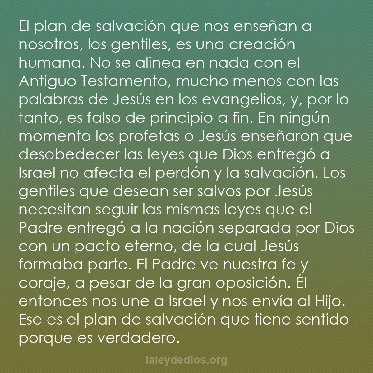 El plan de salvación que nos enseñan a nosotros, los gentiles, es una creación humana. No se alinea en nada con el Antiguo Testamento, mucho menos con las palabras de Jesús en los evangelios, y, por lo tanto, es falso de principio a fin. En ningún momento los profetas o Jesús enseñaron que desobedecer las leyes que Dios entregó a Israel no afecta el perdón y la salvación. Los gentiles que desean ser salvos por Jesús necesitan seguir las mismas leyes que el Padre entregó a la nación separada por Dios con un pacto eterno, de la cual Jesús formaba parte. El Padre ve nuestra fe y coraje, a pesar de la gran oposición. Él entonces nos une a Israel y nos envía al Hijo. Ese es el plan de salvación que tiene sentido porque es verdadero. | “Esta es la voluntad de Dios: que yo no pierda a ninguno de los que me dio, sino que los resucite en el último día.” (Juan 6:39)